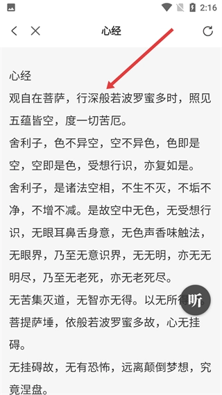 进入心经阅读页面后,不仅可以浏览经文内容,还能通过点击“听”功能播放音频,从而更深入地学习这部经典。