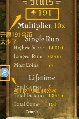 进入游戏后能看到191个金币,点击“钥匙”图标即可进入修改界面。