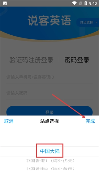 操作时先点击【站点选择】按钮,在弹出的窗口中选定【中国大陆】,接着点击【完成】按钮确认所选站点。