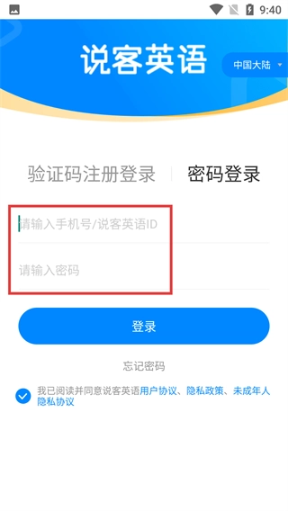 在对应的输入框中填写【手机号/说客英语ID】以及密码,为登录前的信息录入环节做好准备。