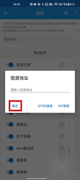 把下方给出的图源地址复制粘贴进去,点击确定就能观看漫画了。