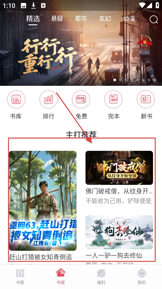 在书城页面,设有主打推荐的小说板块,点击你感兴趣的小说就能进入详情页,开启阅读之旅啦。