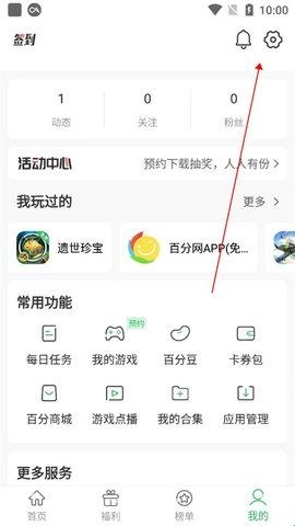 首先我们要进入百分网游戏盒的“我的”板块,然后点击“设置”选项。