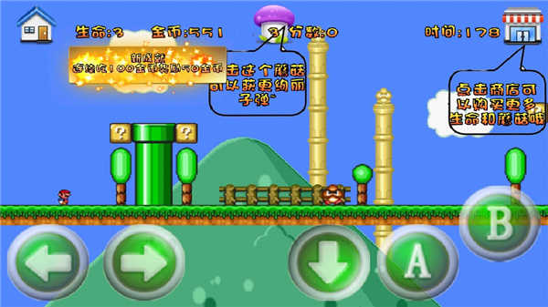 在这款游戏里,玩家借助虚拟摇杆按键来操控马里奥的动作,让他通过奔跑、跳跃、踩踏等方式跨越各种障碍,或是击败敌人,或是避开敌人。