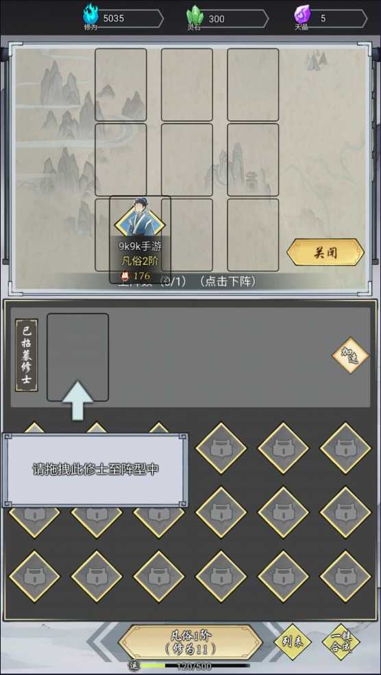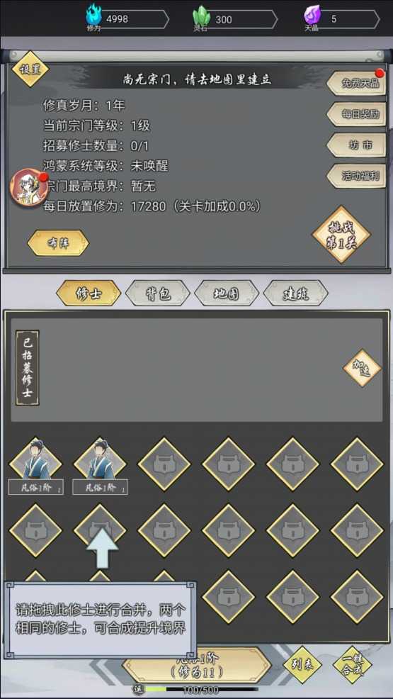 3、拖拽两个相同的修士进行合并,两个相同的修士可以合成一个更高境界的修士。