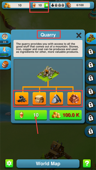 消耗【10】个水晶解锁【Quarry】后,能够获取石头、铁、铜、煤等资源,而这些资源正是制作高价值产品所需的原料。