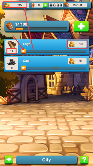 在城市界面进行资源交易,例如卖出【14】个木材能得到【10】金币,借助资源交易积攒金币来增强发展能力。