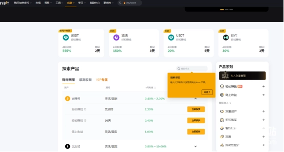 Bybit的金融板块以多元化理财产品为核心,界面清晰划分“稳定回报”“最高收益”“VIP专属”等类别,展示比特币、以太坊等主流资产的不同期限与收益率选项,并支持快捷投资操作;同时提供代币搜索功能,便于用户快速定位目标产品,结合右侧产品系列导航,全面覆盖轻松赚钱、链上收益等场景。