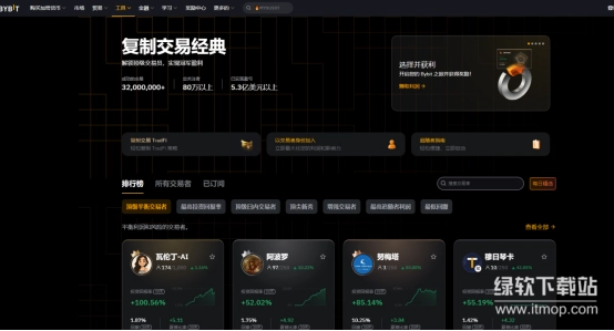 Bybit的“复制交易经典”功能界面集成了关键数据展示与操作入口,顶部突出显示总交易用户规模、高收益比例等核心指标,增强用户信任;中部以排行榜形式呈现顶尖交易者及其收益率,支持按策略类型筛选,便于跟随者选择;右侧设置“选择并获利”等快捷操作按钮,简化跟随交易流程。