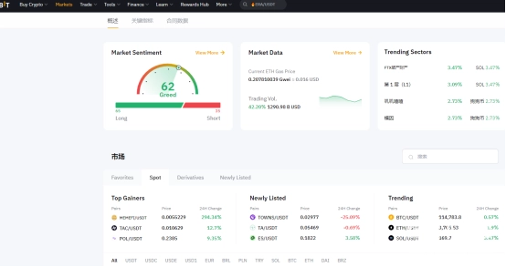 Bybit的市场界面以数据驱动为核心,集成市场情绪仪表盘、实时数据概览、趋势板块追踪及多维度涨幅排行等功能,通过可视化图表与智能分类标签(如现货、新上市、热门板块),帮助用户快速捕捉市场动态、评估情绪偏向并筛选潜力代币。