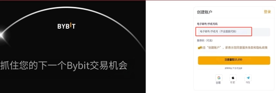 在注册页面:选择首选的报名方式:电子邮件或手机,输入相应的必要信息,阅读并同意 Bybit 服务条款和隐私政策后,点击创建账户。