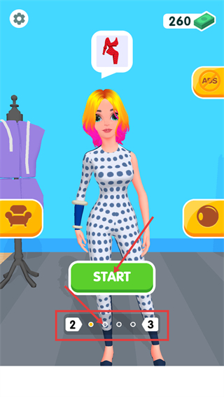 点击【START】按钮,启动【2-3】阶段的服装改造任务,并根据上方的服装图标进行设计。