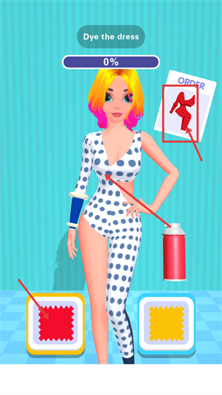 参与【Dye-the-dress】任务,挑选红色染料,依据【ORDER】图标对服装进行染色。