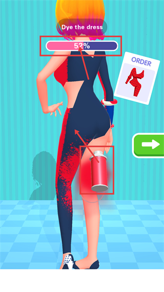 关注【进度条-52%】,请使用红色喷罐继续进行染色操作,以完成服装染色的任务。