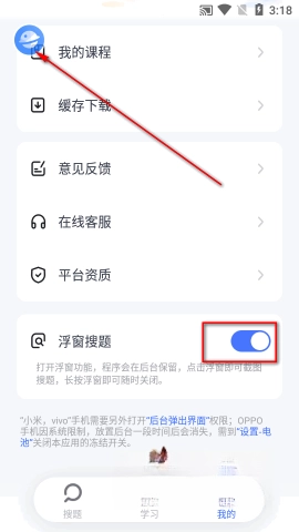 进入软件界面后,点击“我的”选项,接着将页面滑动至底部,最后开启浮窗搜题功能。