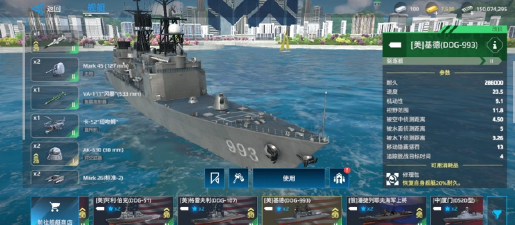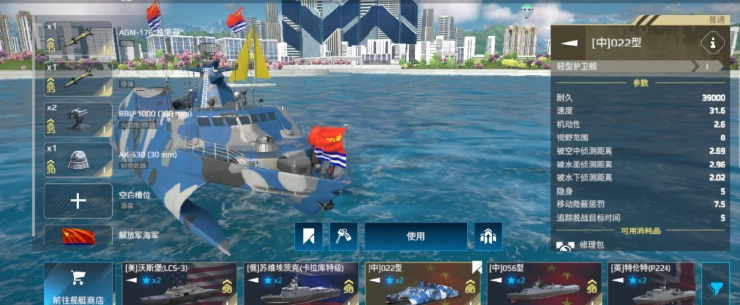 022有着非常小的体型和31.6节速度还有2导弹2火箭炮的火力配置,也是少有的自带皮肤的船,一级唯一能带一级火箭炮的,但是血量低,所以不太适合萌新,有一定的操作门槛。