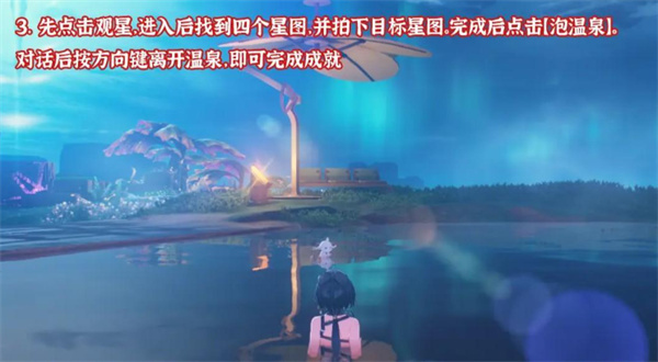 ** 先点击观星,进入后找到四个星图,并拍下目标星图,完成后点击泡温泉,对话后按方向键离开温泉,即可完成成就