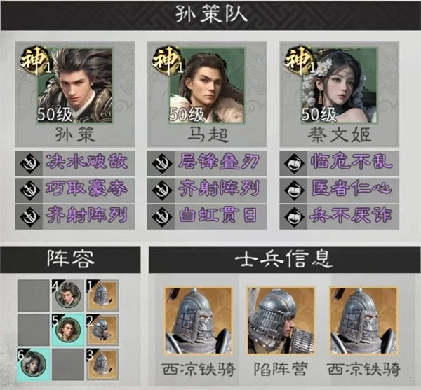 1、这队三个英雄在前期都能免费获得到大量碎片,很容易提升到较高品质,在马超和蔡文姬的辅助下孙策可以打出高额伤害,同时也是官方推荐阵容。