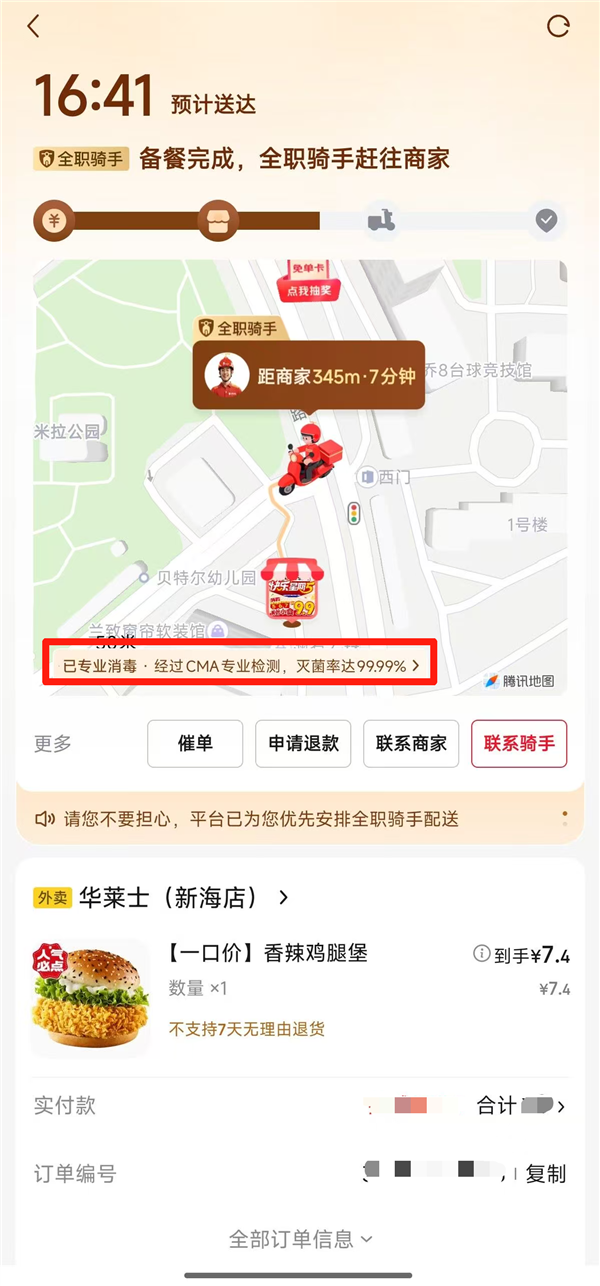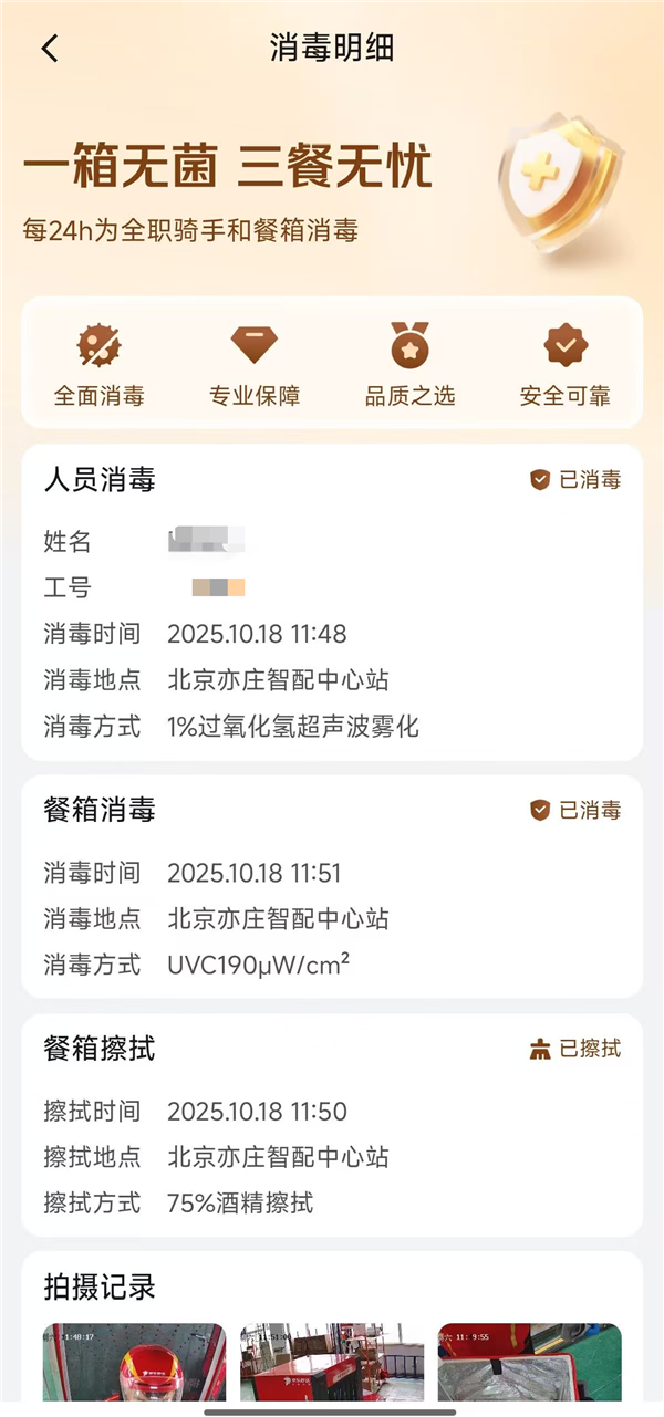 当全职骑手带着消毒后的餐箱送餐时,用户将在订单页看到餐箱“已专业消毒”提示,还能查看骑手和餐箱当日消毒全过程视频,以及专业机构的检测报告。