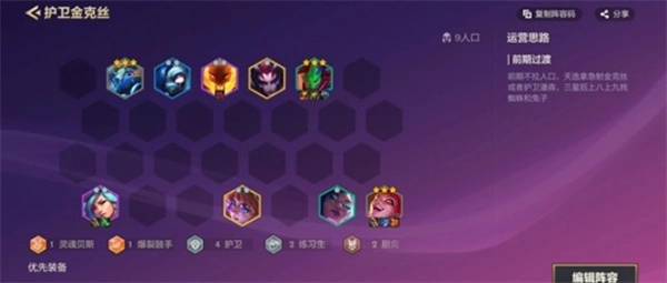该阵容核心在于金克丝的持续输出能力,护卫体系提供稳定前排,整体结构清晰,不依赖复杂转型。