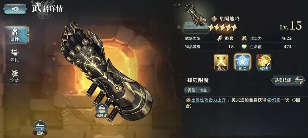 以土机神为核心的背水土队,其配队思路是优化掉原有斧子姐等角色,融入土机神。武器配置上,推荐将图中两把武器替换为背水剑(若已有一把五星的黑爷爷材料合成拳套,则只需一把背水剑)。土机神的专属武器需要进行特定附魔以最大化收益。