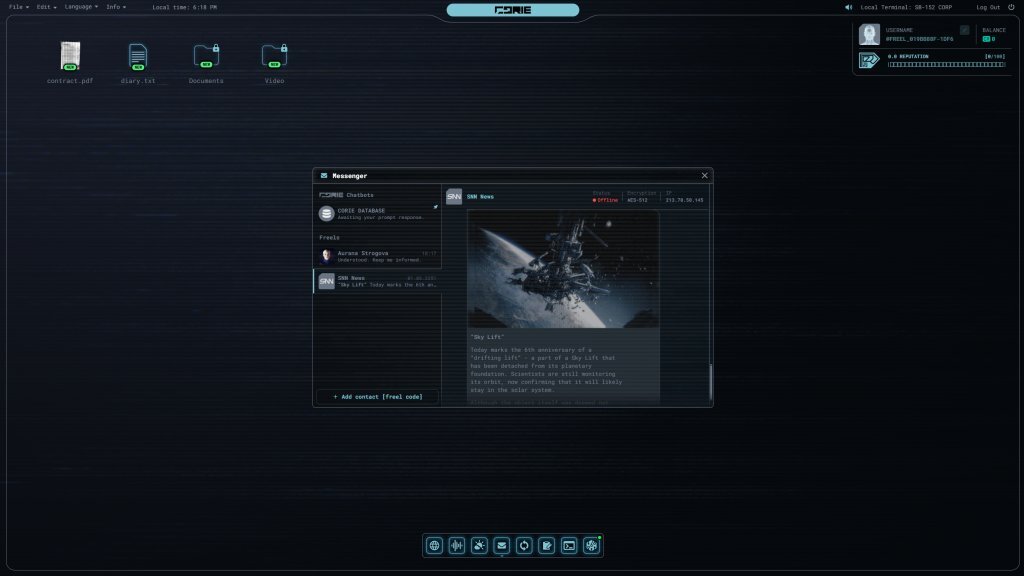 网站本身构建了一个名为CORIE的可交互操作系统界面。用户登录后,可以查看信息、使用虚拟浏览器、收听广播、更新模块并完成每日挑战。这些挑战涉及探查文件字符串、寻找错误等解谜内容。界面设计呈现第一人称视角,用户可以观察地下掩体环境中的物品,营造出浓厚的复古未来与末日氛围。