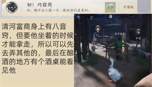 跟随清河富商移动,等其在酒坊坐下放松警惕,偷取其身上的八音窍,并成功放入藏宝点