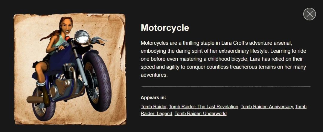 官方网站列出了构成劳拉身份的五大关键元素:双持手枪、弓箭、2013年重启作品里首次亮相的翡翠吊坠、克劳馥庄园,还有摩托车——这一元素被称作“劳拉冒险装备中极具吸引力的一环,彰显着她不凡生活方式的内核”。