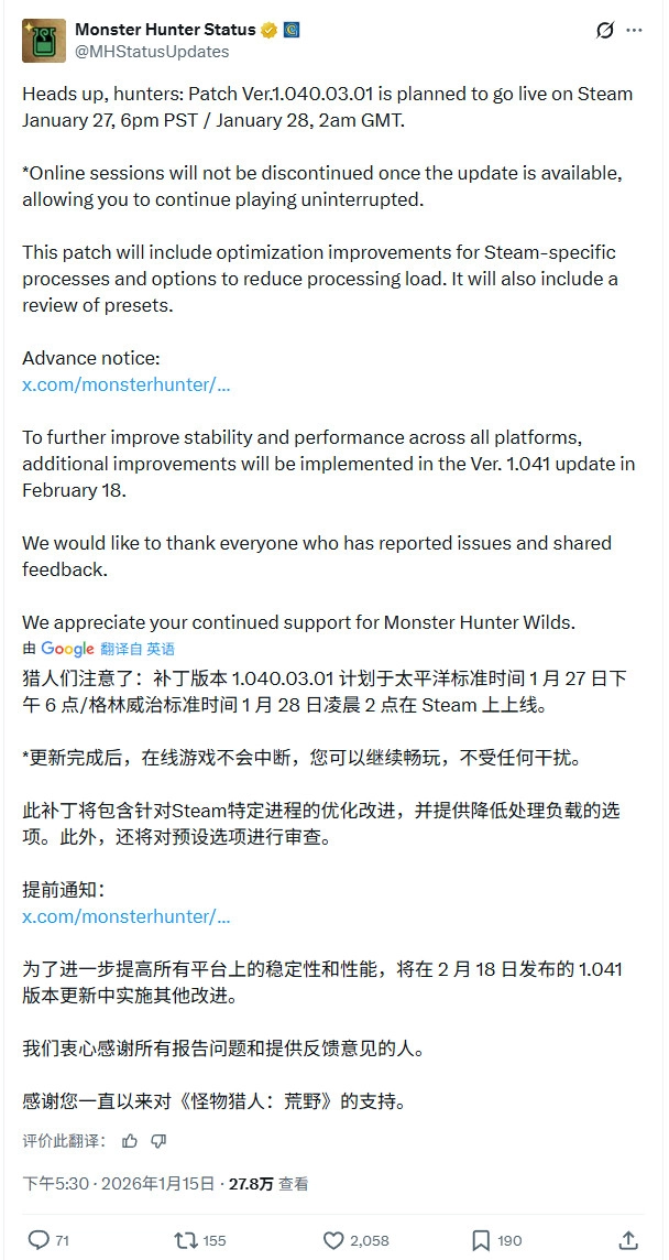 怪物猎人荒野Steam版性能优化补丁1月28日上线