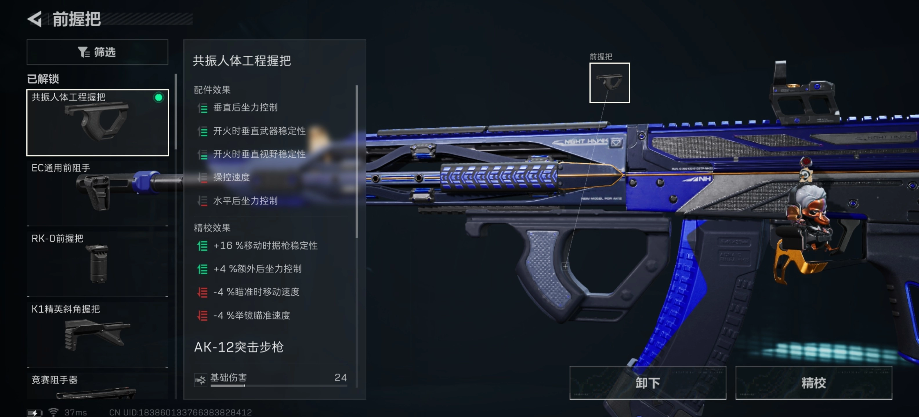 3、前握把选择垂直万金油之二的,共振人体工程握把。和沙暴垂直补偿器都拥有着减少枪械垂直后坐力的属性,可以提升枪械稳定性。