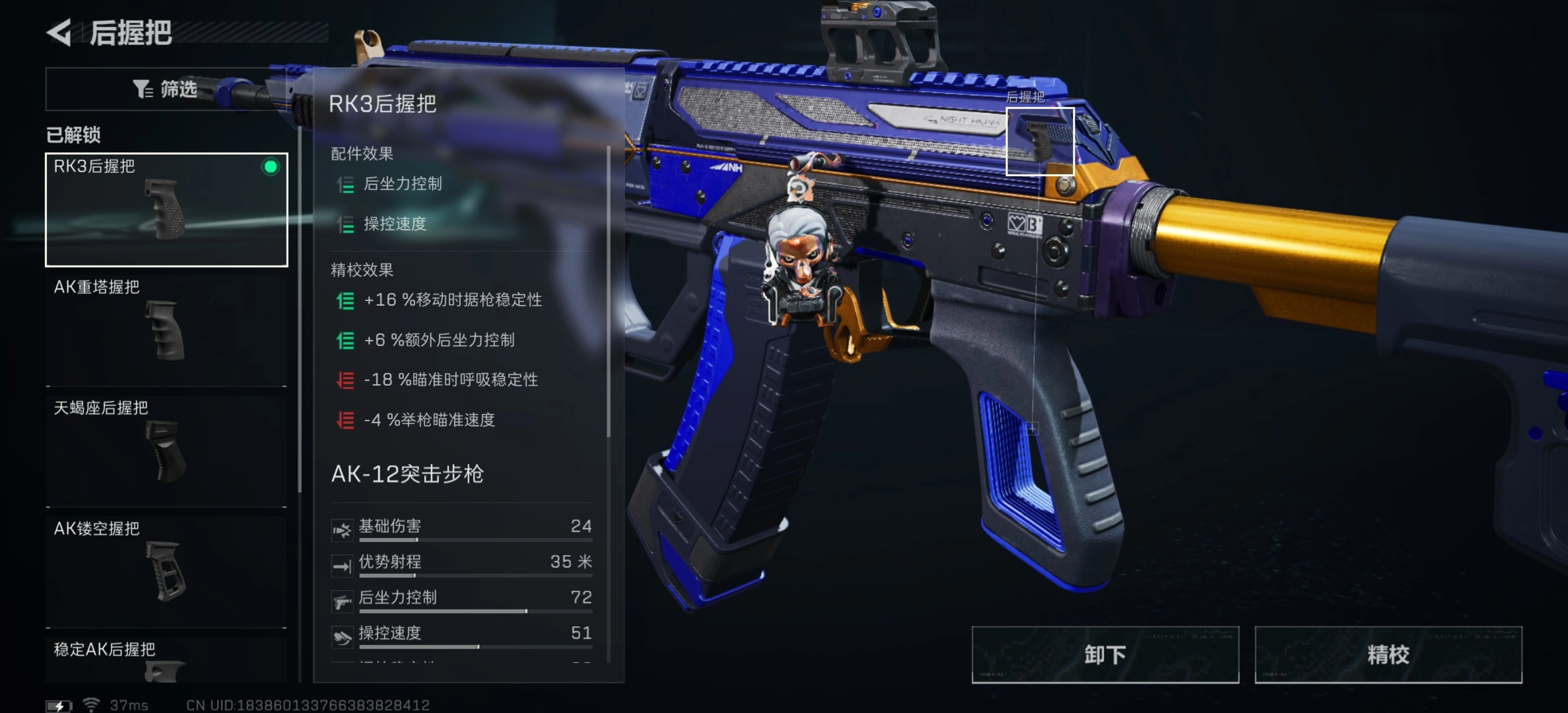 4、后握把选择RK3后握把。这个握把可以提升枪械的操控速度以及后坐力控制,并且没有任何负面属性,能够减少枪口、枪管、前握把带来的负面操控速度属性。