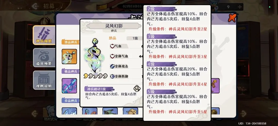灵风幻影:核心追击神兵,能显著提升追击伤害,因其获取相对容易,推荐资源足够时升至四星。