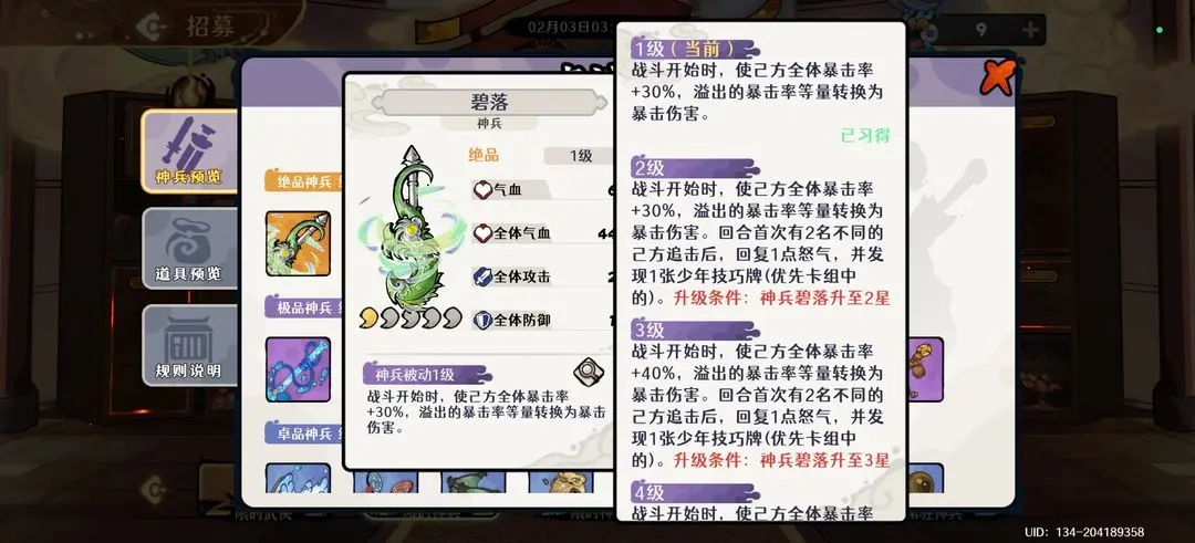 碧落:核心中的核心,提供大量暴击率并能将溢出暴击转化为爆伤,推荐优先升至三星以获得40%暴击率。