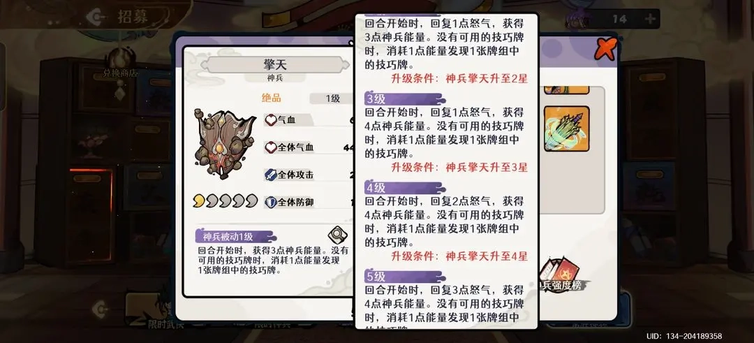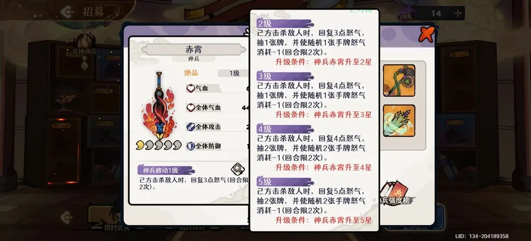 第三神兵选择:擎天是优选,其抽牌效果能保证暴追流技巧牌的流畅循环;若资源有限,则可选择获取简单的万金油神兵赤霄作为过渡。