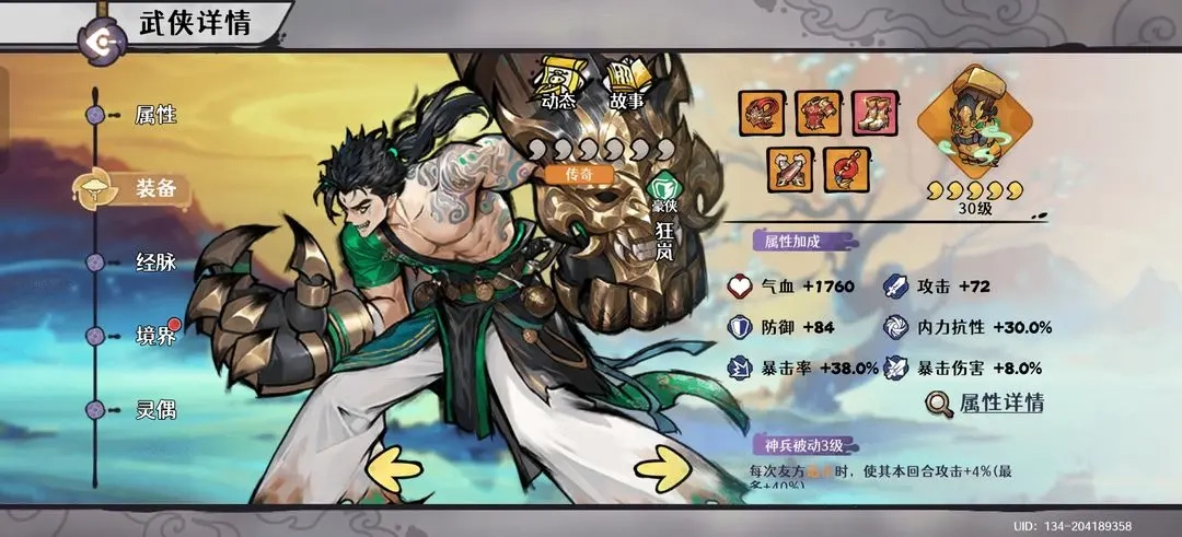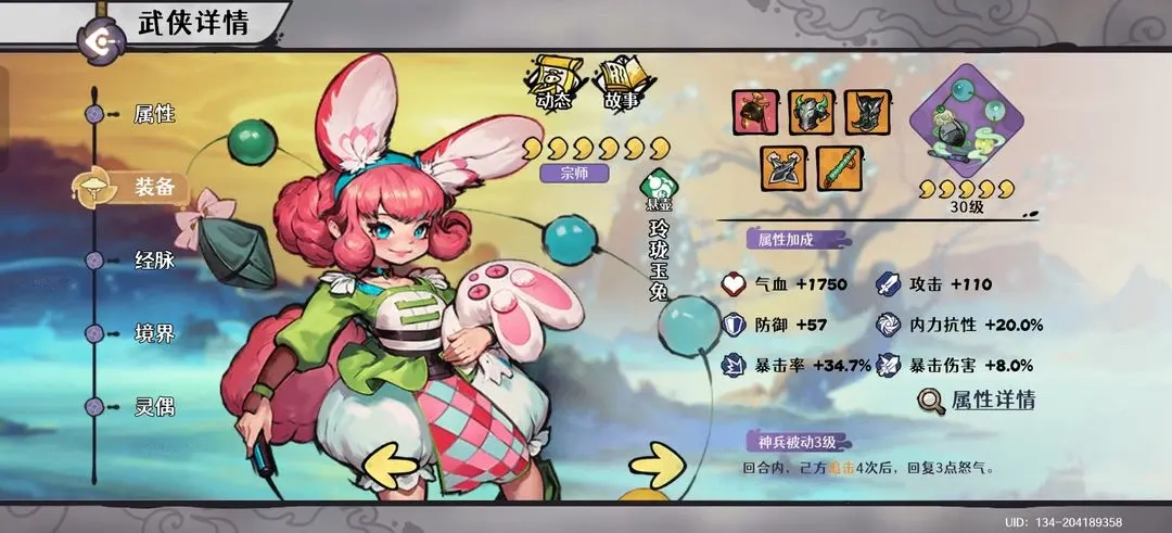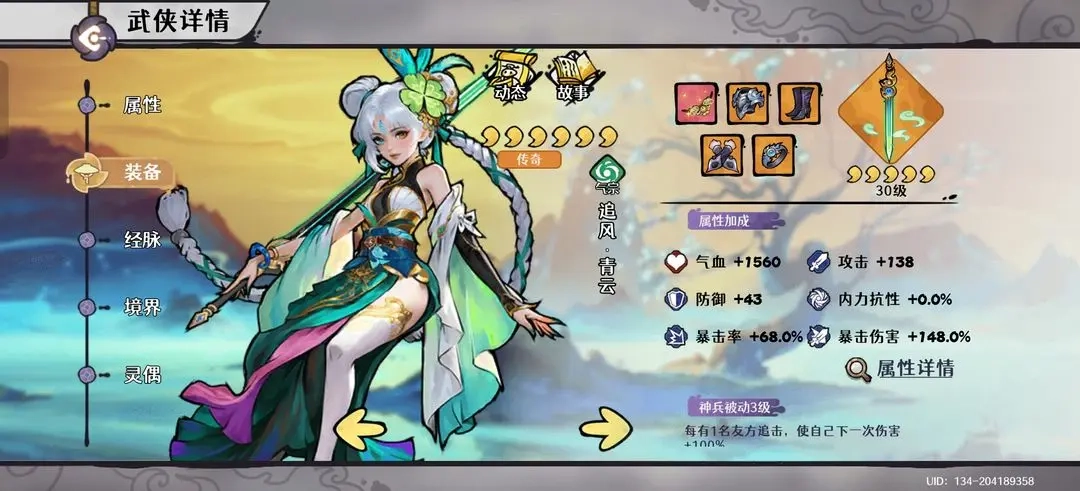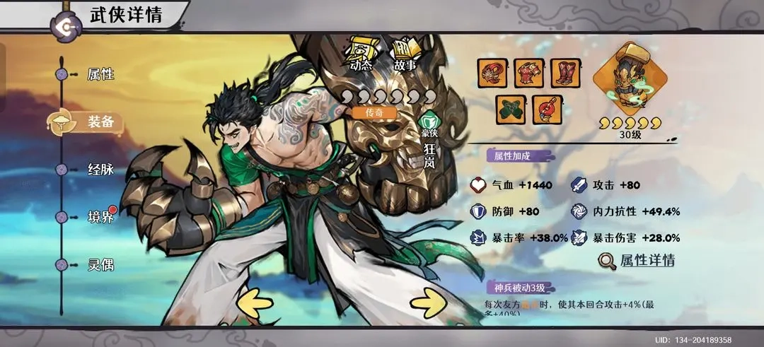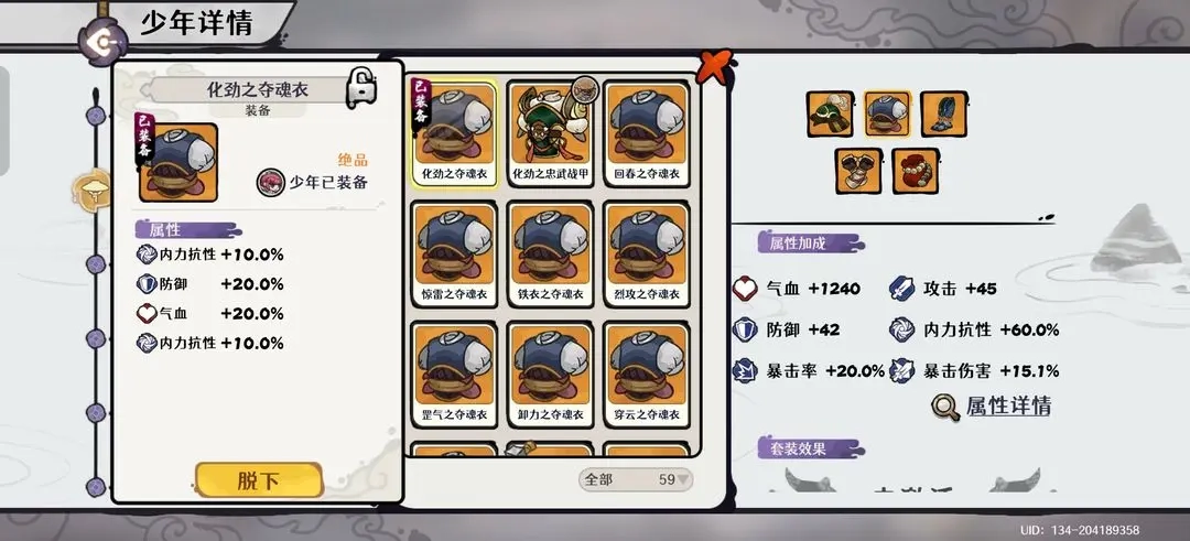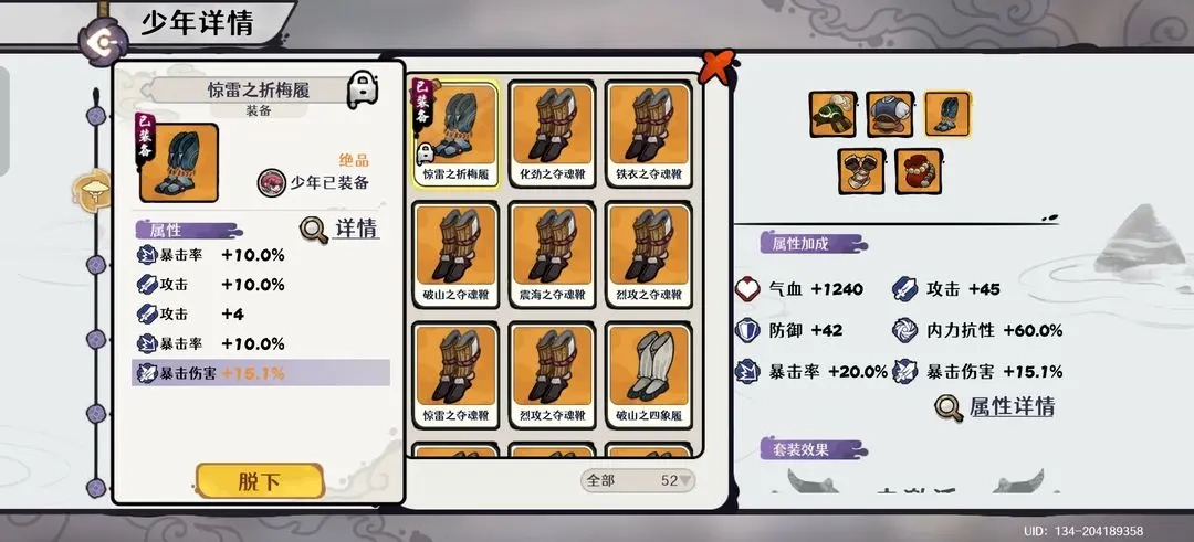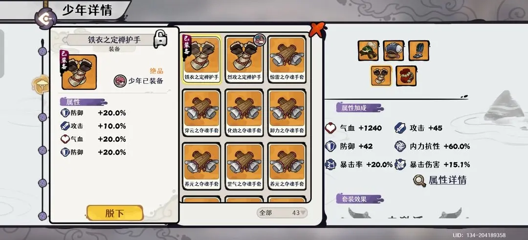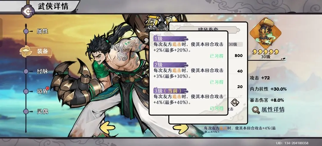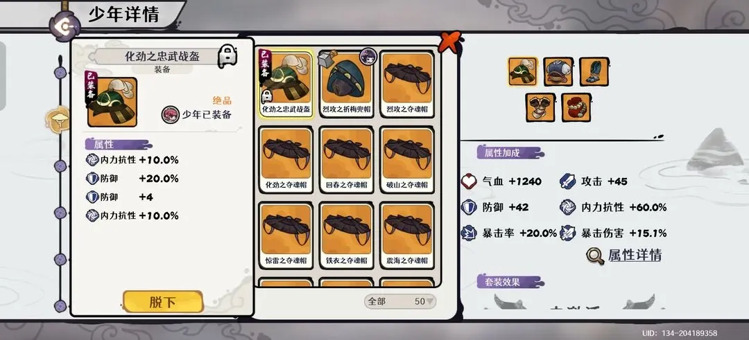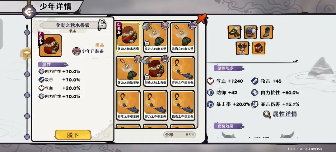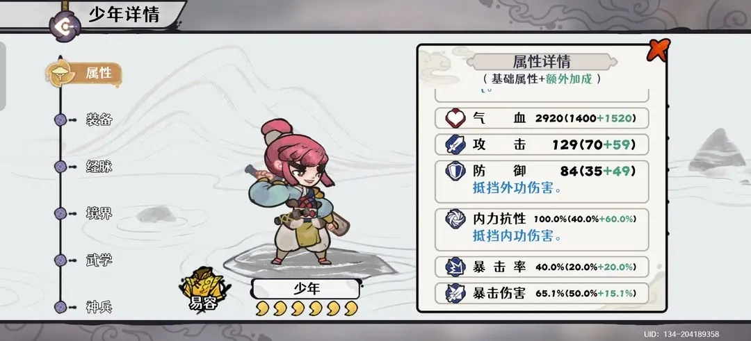 少年自身:装备需堆砌至100%内力抗性以增强生存,同时也要提供约40%的暴击率以支持全队暴击达标。