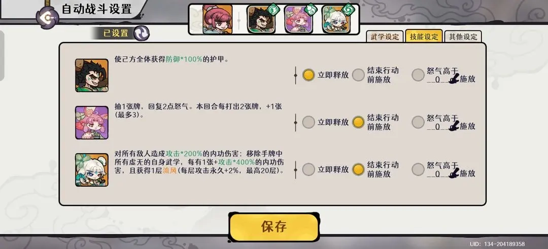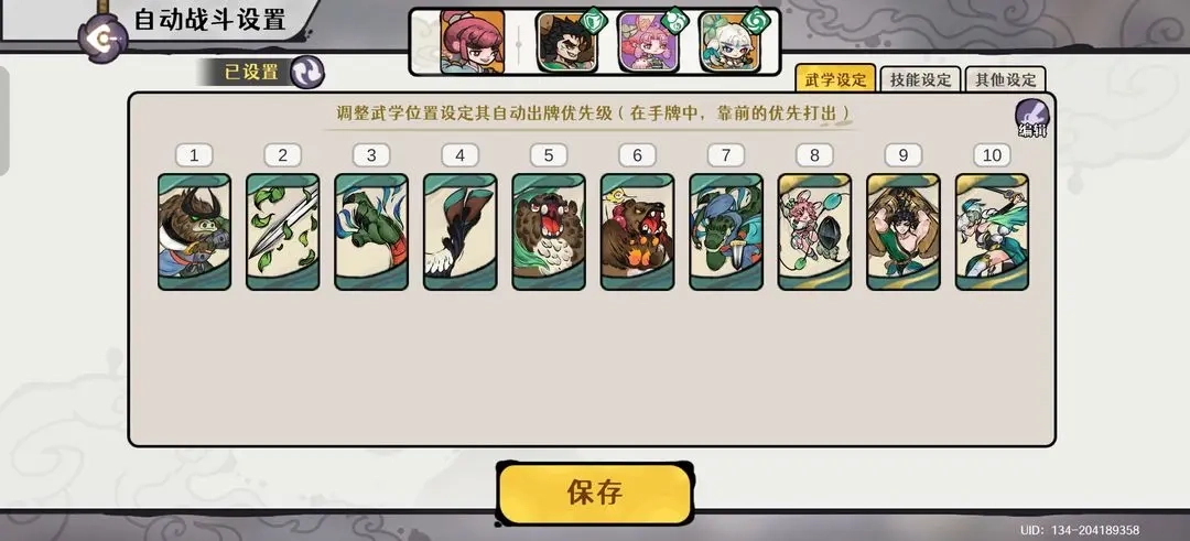 在卡牌选择上,需携带大师姐的全部攻击卡和技巧卡,以及劲夫的神兵卡和兔子的治疗卡。自动战斗设置中,应将大师姐的追击技能设置为优先释放,并关闭不必要的自动技能以避免干扰输出循环。