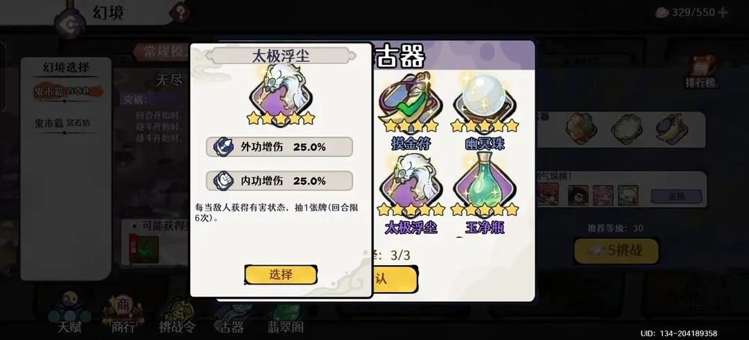 进入无尽幻境后,优先考虑的古器是韩月盏与千机匣,前者可提供珍贵的初始灵力,后者能提升关键卡牌的抽取几率。第三件古器建议选择太极浮尘,它的额外抽牌机制能有效避免暴追流在战斗中出现卡牌短缺的情况,确保输出过程的流畅性。