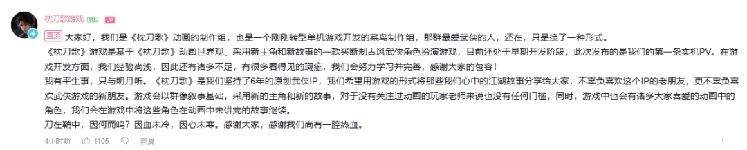 发布预告之后,《枕刀歌》官方还在评论区留言,表示自己是刚转型做单机游戏开发的新手制作组。