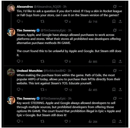 Sweeney在多次回复中承认,Steam激活码和DLC确实可以通过第三方平台购买,但他强调关键问题在于:在遵守Valve规则的前提下,开发商无法在游戏内向玩家提供替代购买方式——这与Epic当年起诉苹果和谷歌的核心逻辑几乎完全一致。