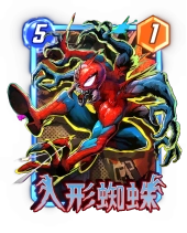 规则:卡组内的每一位蜘蛛侠移动后,+5战力。回合结束:随机移动两张牌