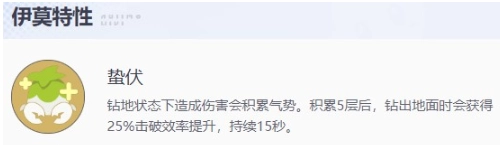 然后让自己积累足够的气势,在其中有5层气势之后它就会钻出地面,此时带来25%的输出提升,而且再次还会带来一定的击破概率,持续的输出时间也达到了15秒,在蓄势待发这个特性效果当中。