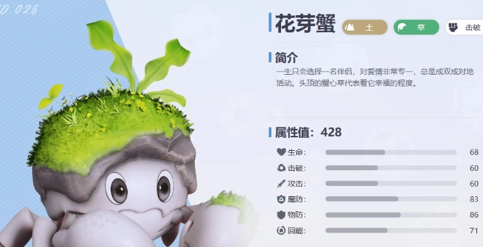 ,因为花芽蟹当前的能力当中属于土系跟草系双系别的一个击破类型宠物,它当前基础的属性值达到了428,后期再能力效果上面可以带来更多钻地的技能。