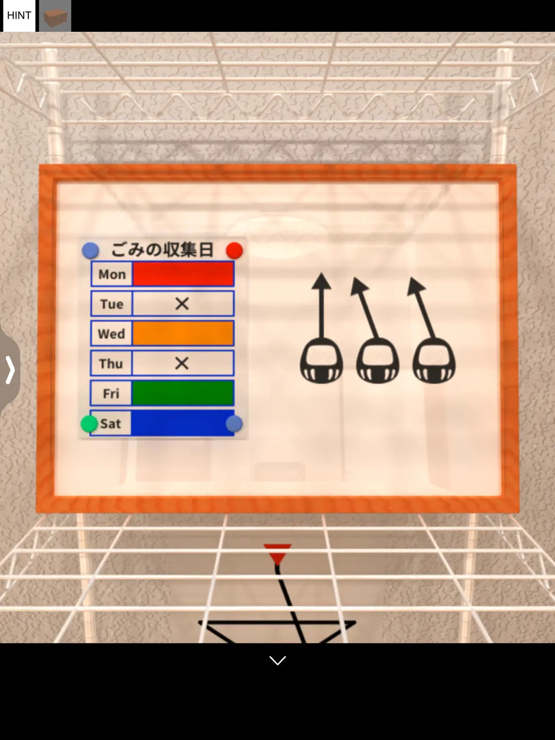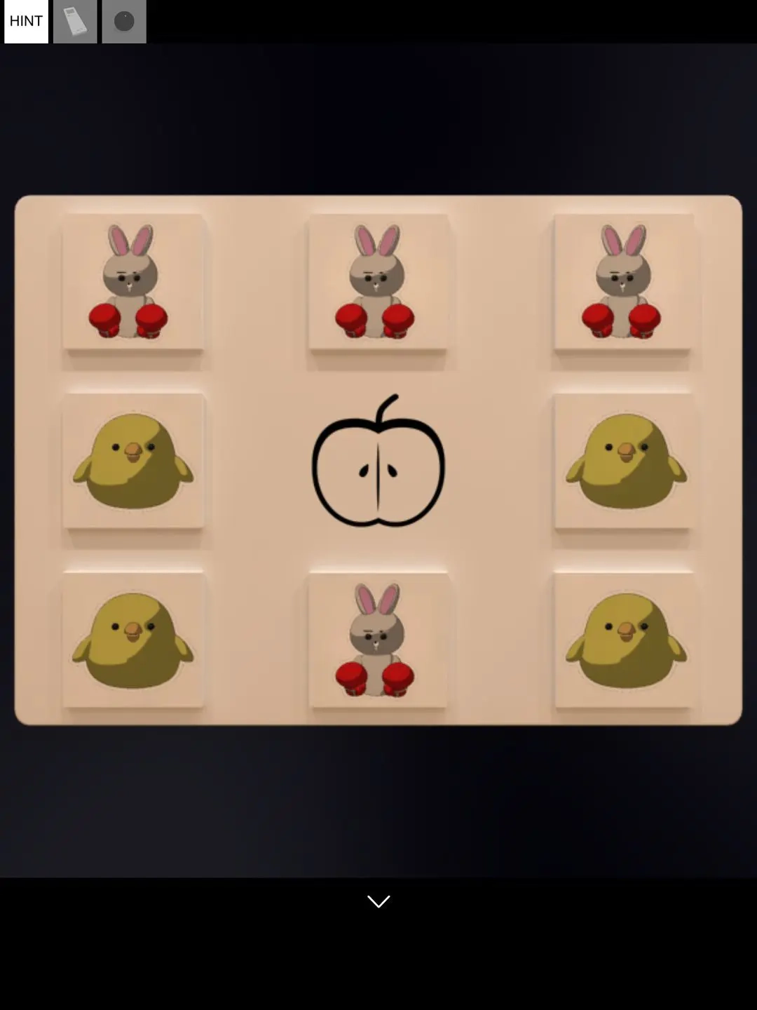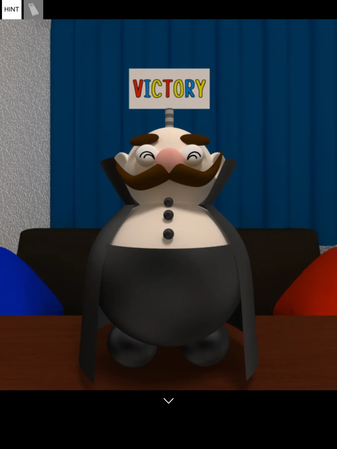 4、棋盘右边的玩偶标签上写的VICTORY,按照红蓝黄红黄蓝黄的顺序排列,这是【老虎区】右下角柜子的点按顺序,按顺序点击不同颜色,得到一个黑色小球,还能看到右边放了刀具。