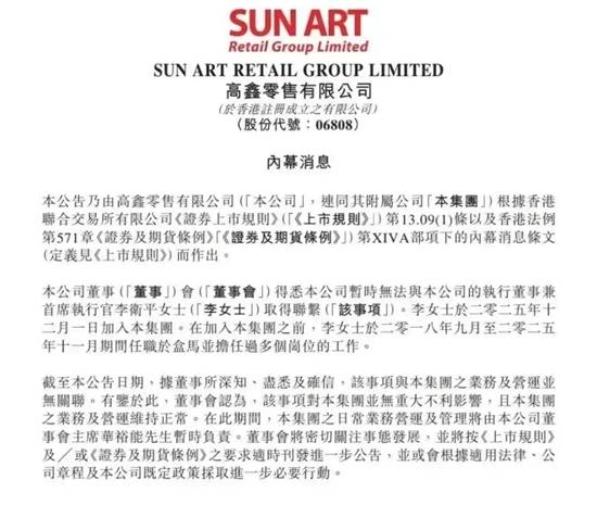 据澎湃新闻消息,2月4日上午,大润发的母公司高鑫零售有限公司于港交所发布公告表示,公司董事会了解到,目前暂时无法与执行董事兼首席执行官李卫平取得联系。这也表明,这位上任仅两个月的上市公司CEO处于“失联”状态。