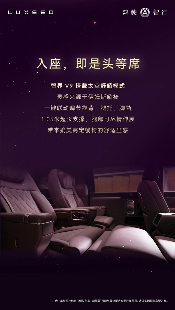 二排座椅搭载太空舒躺模式,键联动调节靠背、腿托、脚踏,1.05米超长支撑,腿部可尽情伸展。