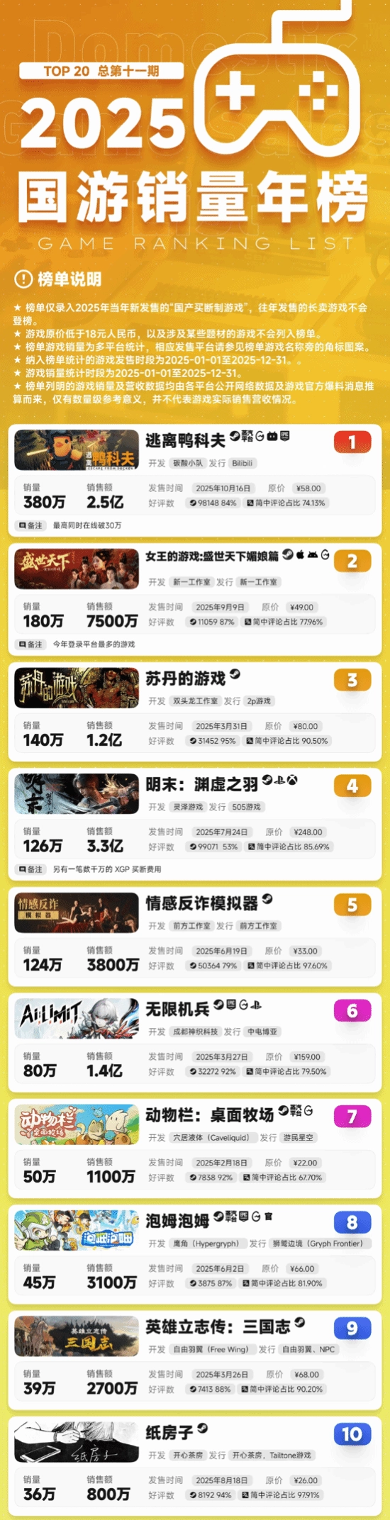 日前,2025年度国产游戏销量排行榜正式公布,类魂题材作品《明末:渊虚之羽》凭借126万份的销量成绩与3.3亿元的销售额,在榜单中位居第四位。