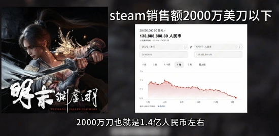 她援引海外分析机构gamediscover.co的估算,指出2025年Steam年度畅销榜前100名的最低收入门槛约为2000万美元。由于《明末》未进入前100名,其Steam年收入理论上应低于此数值(约合人民币1.4亿元)。按游戏标准版248元售价粗略推算,销量上限约为56.5万套。