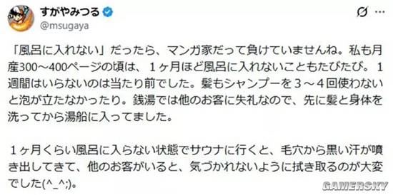 随后,75岁的资深漫画家菅谷充(すがやみつる)回应并讲述了自己的亲身经历。他提到,在自己每月需要绘制300到400页漫画的巅峰时期,经常整月都无法洗澡,以至于后来觉得一周不洗也成了常态。