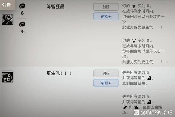 降智狂暴(脑力变0,但每回合多打一次平a,然后可以选择将全部法力值变成力量值。红猫后期力量会很高,法转力之后更是轻松突破40,多a这一下伤害巨爆炸,有极少数情况不宜反复冲撞boss的时候可以用这多的一下平a)