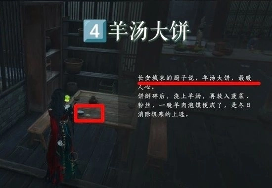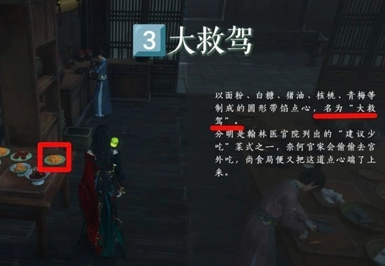 2.进去厨房先与青棠对话,试吃素方肉,然后按照图位置偷吃素烧鹅,大救驾,羊汤大饼共四种食物
